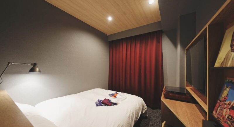 大きめのシモンズベッド(ダブル)を備えた道後hakuroのスタンダードルーム。「暮らすように泊まる」を満喫いただけるコンパクトなお部屋です。ベッド幅は150cmになります。