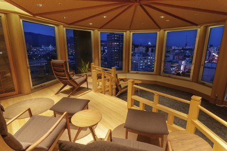 ライトアップされた高知城が望める展望の湯上りどころ。大好評のゆず茶もぜひお楽しみください。