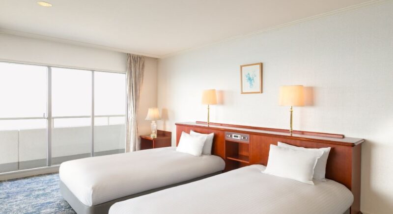 開放感のある広々とした洋室。ベッド幅は140cmにてご用意しております。3名様以上は、ソファベッドでのご利用となります。オーシャンビューとマウンテンビューのお部屋がございます。