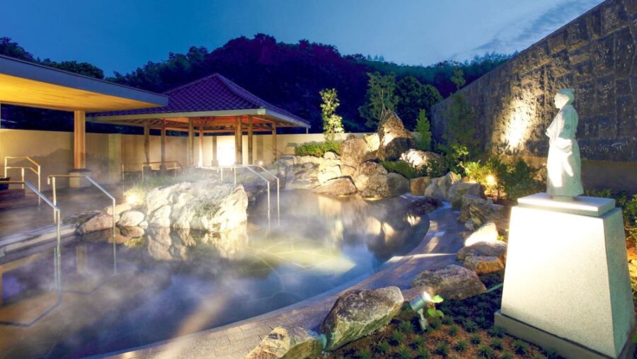 自家源泉の開放感あふれる露天風呂は高知県の名勝桂浜と室戸岬をモチーフに作られており、坂本龍馬像と中岡慎太郎像が建っています。※男女入替制