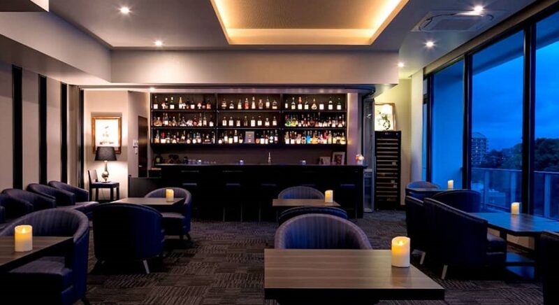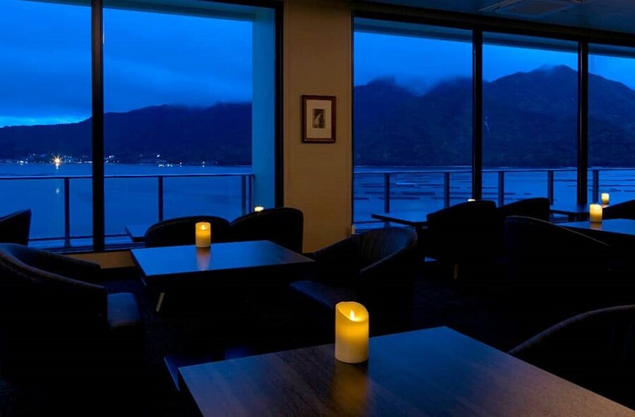 ホテル最上階から宮島と瀬戸内海の景色を一望できるバーで美味しいお酒をお楽しみください。日中はフリードリンクコーナーとして開放しております。