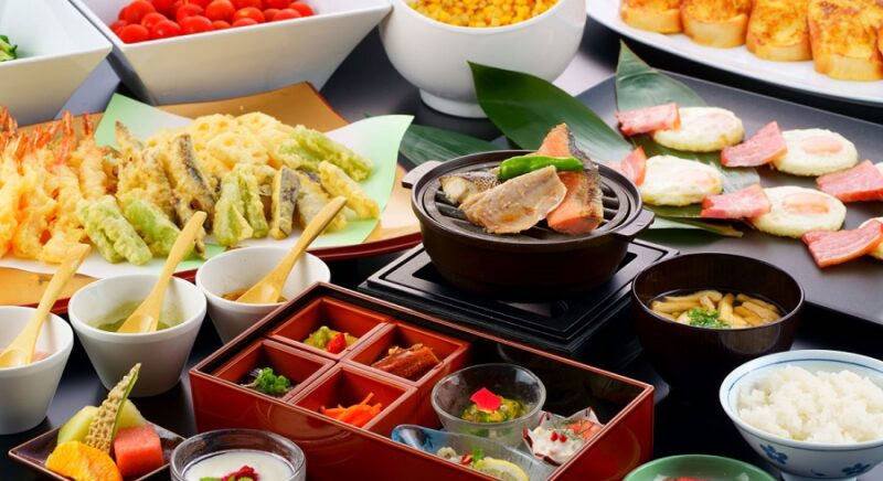 御膳付きハーフバイキングをお楽しみください。地産地消をコンセプトに和食膳と共に揚げたての天麩羅などもお召し上がりいただけます。