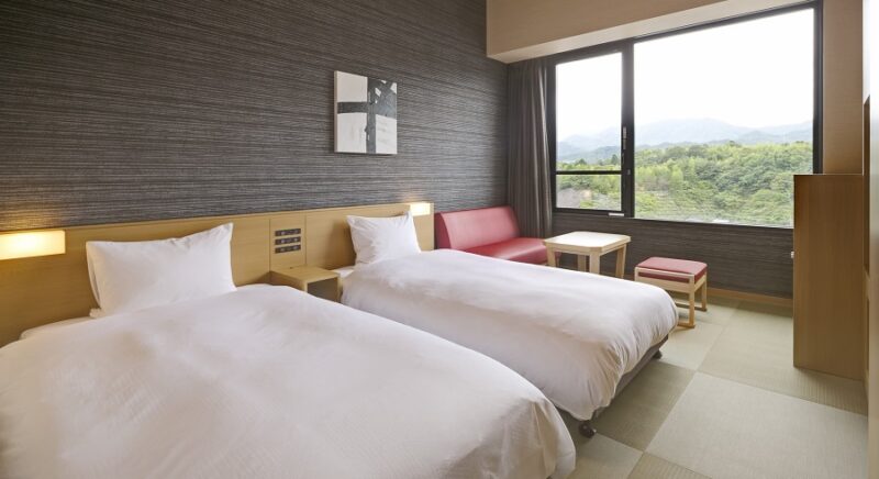 四季折々の景観を楽しめる山側のお部屋。和をモチーフにした客室でおくつろぎください。110cm幅のベッドをご用意。