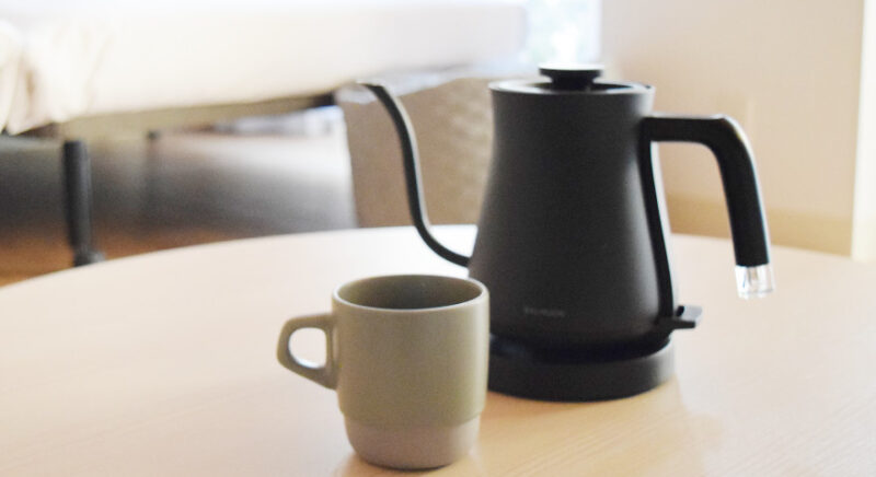 全室バルミューダの電気ポットを完備。お茶も備えてございますので、くつろぎのひとときをお過ごしください。