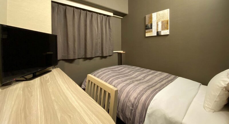 110cm幅のベッドをご用意。機能的で居心地の良いお部屋です。禁煙室と喫煙室がございます。シングルルームはリクエストでのお預かりとなります。