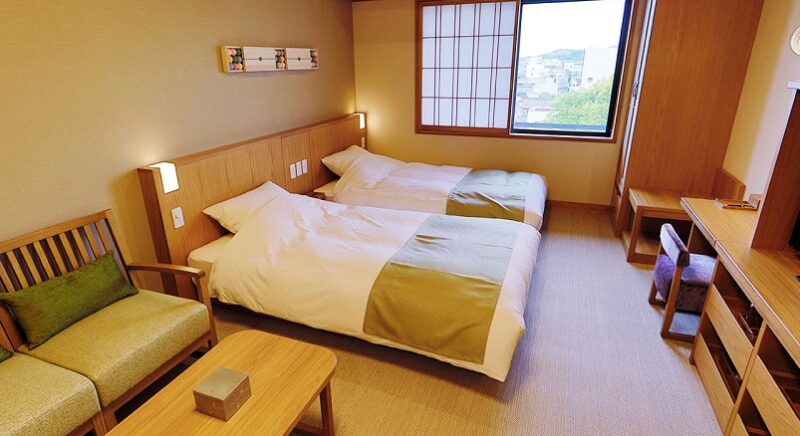木材をふんだんに使ったぬくもりあふれるツインのお部屋。大切な方とゆったりとした時間をお過ごしください。ベッド幅は120cmにてご用意しております。全室禁煙となります。