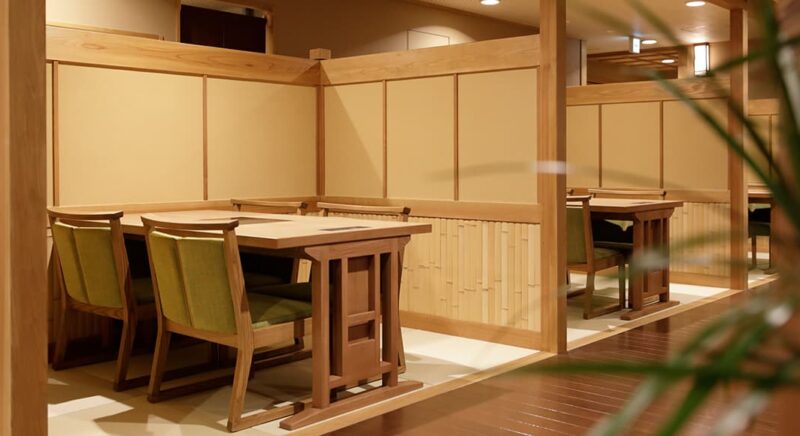 木のぬくもりを感じお寛ぎいただける空間です。お席には間仕切りがございますので、安心してご利用いただけます。