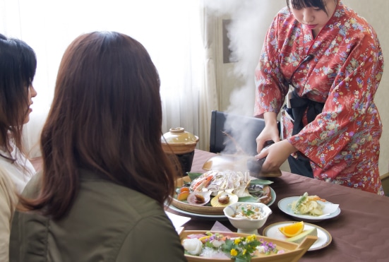 来島海峡ではぐくまれた海の幸や旬の味わいに舌鼓。料理長自慢の水軍時代の豪快さを残す海鮮料理や宝楽焼をご賞味ください。
