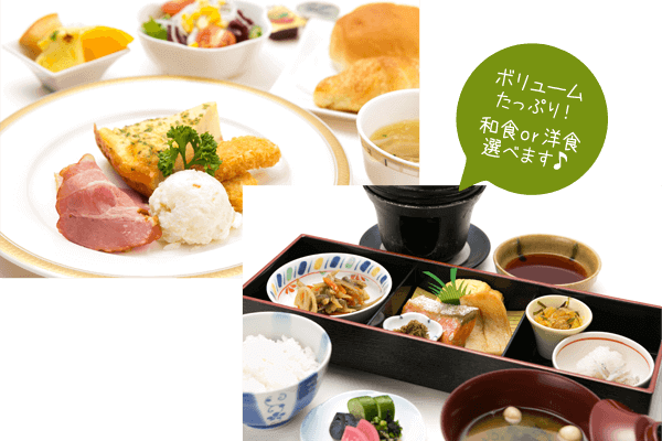朝食はボリュームたっぷりの定食になります。和食・洋食、気分に合わせてお好きな方をお選び下さい。