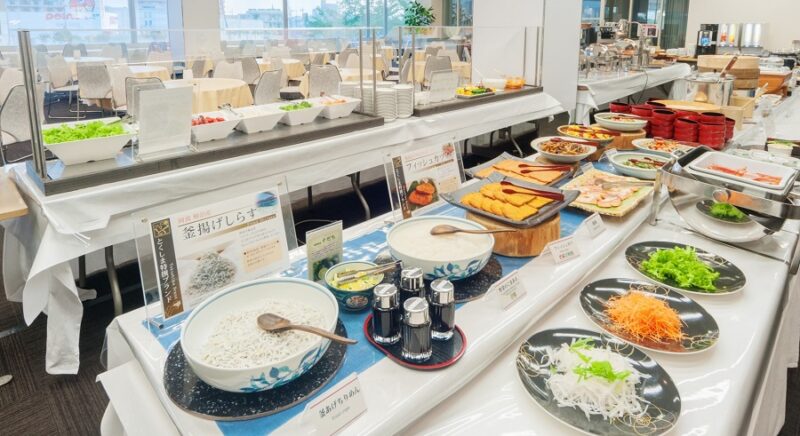 鳴門の鯛ご飯や徳島ラーメン、祖谷地方の郷土料理「そば米汁」など約40種の和洋ビュッフェにてご用意しております。メニュー内容は変更になる場合がございます。
