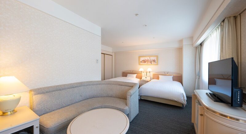 ゆったりとした空間でプライベートの時間を満喫できるデラックスツインルーム。ベッド幅は120cmでご用意しております。