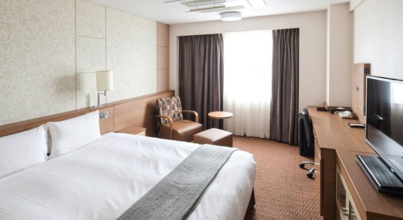 ベッド幅180cmでご用意。全室シモンズベッド完備。広々とし快適な客室です。※福山城を望める高層階のお部屋です。