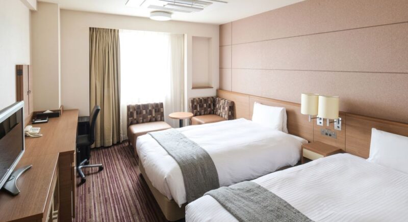 ベッド幅120cmをご用意。全室シモンズベッド完備。快適で機能的な客室です。※福山城側のお部屋になります。