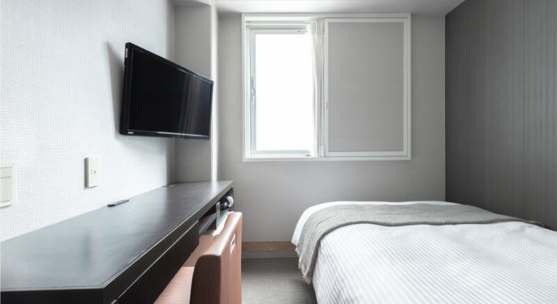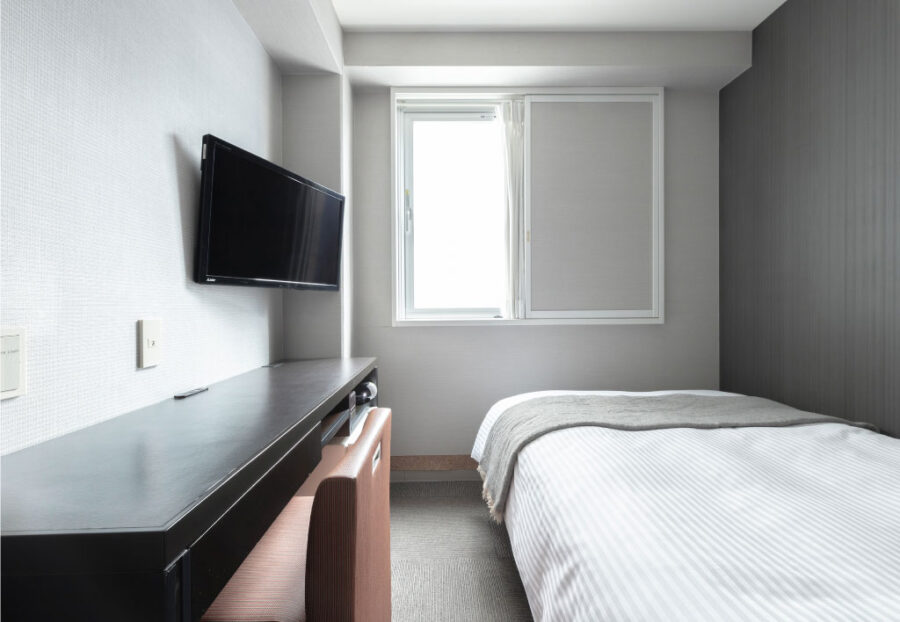 ベッド幅120cmでご用意。セミダブルとしてもご利用可能です。全室シモンズベッド完備。コンパクトで機能的な客室です。