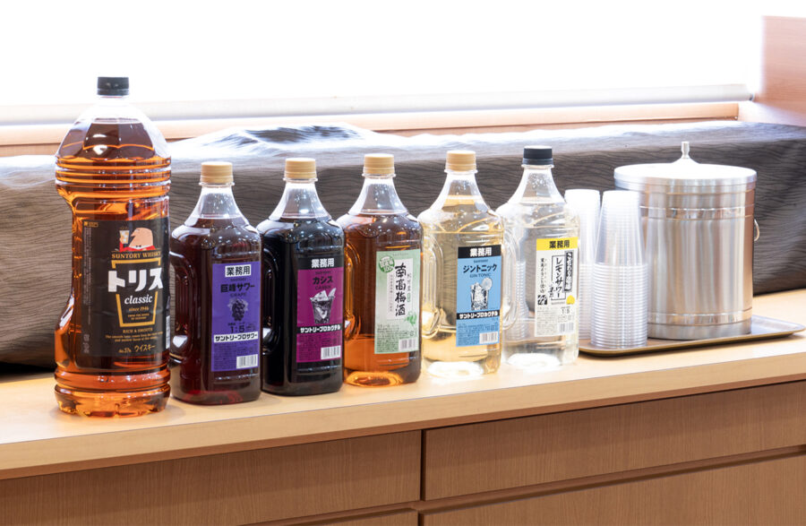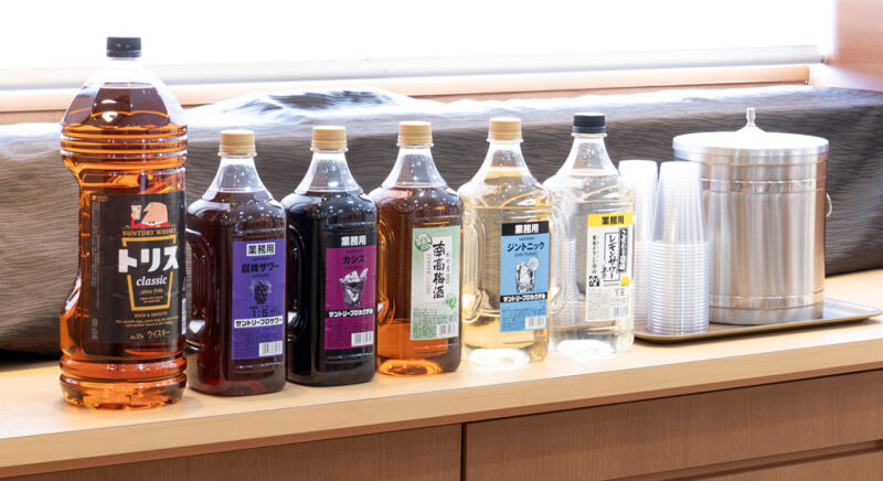 1Fラウンジでは、ジュースやコーヒー、お茶などのウェルカムドリンク、ウェルカムバーではハイボールや酎ハイなど6種類のお酒をお楽しみ頂けます。ドリンクのお供にウェルカムケーキもどうぞ。