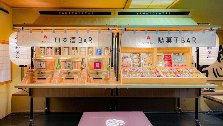 ご宿泊のお客様に無料でご利用いただける屋台をご用意!お風呂上りにキリリと冷えた地酒を楽しめる「日本酒BAR」と子供も大人も楽しめる「駄菓子BAR」がございます。