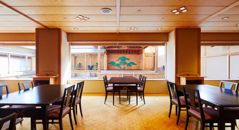 開放的な空間のレストラン。すぐ目の前、ガラス越しに見えるのは能舞台。神々しくも見える静謐な舞台を眺めながら、シェフ自慢の料理をお楽しみください。