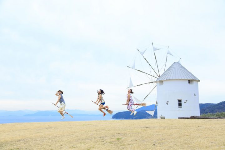小豆島でもイチオシのSNS映えスポット!魔女の宅急便の実写版映画のロケ地になった小豆島オリーブ公園。「魔法のほうき」の無料貸出あり。キキになりきってギリシャ風車の前でジャンプして撮影するのが人気♪瀬戸内海を見下ろせる小高い丘にある園内にはイングリッシュガーデンや小豆島の特産品を扱う売店、温泉、クラフト体験工房、レストランなどが揃う。