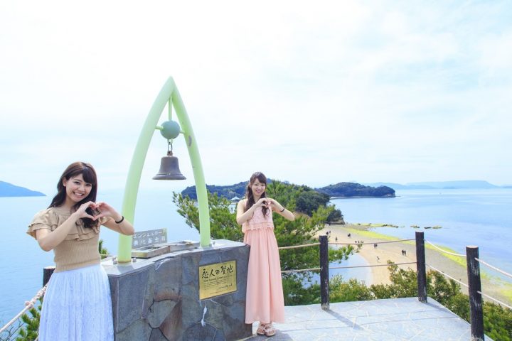 チャンスは1日2回!干潮時間をチェックしてエンジェルロードへ。干潮前後の3時間のみ現れる砂の道は手を繋いで歩くと天使が願いを叶えてくれると言われており恋人たちの聖地として人気スポットに。エンジェルロードの入口付近から登った先にある約束の丘展望台の「幸せの鐘」も鳴らしてみよう。