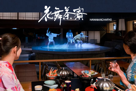 二階吹き抜けの中央に舞台をしつらえたお食事処、花舞茶寮。