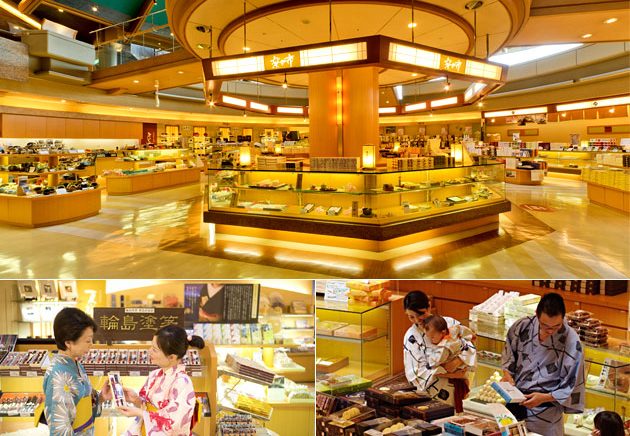 地下1階のおみやげ処“楽々市”は、広いフロアに加賀・能登の名産品を揃えています。輪島塗や九谷焼の逸品、能登の珍味、金沢の銘菓などをゆっくりとお選びください。