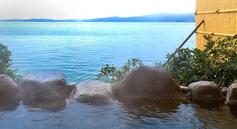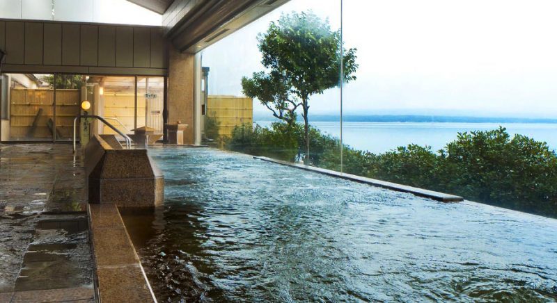 七尾湾に面した浴槽は全面ガラス張りで、能登島の姿もくっきり。