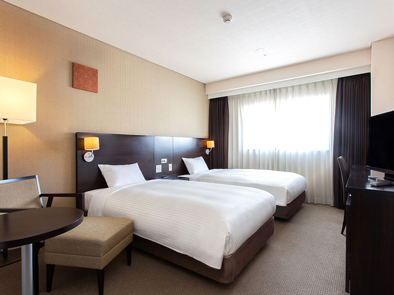 ツインはダークブラウンの家具とベージュのカーペットを基調とした落ち着いた雰囲気です。