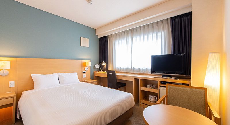 最も多い客室タイプとなる17m2のダブルは、窓に向けてデスクを配し、狭さを感じさずスッキリとした空間に仕上げております。