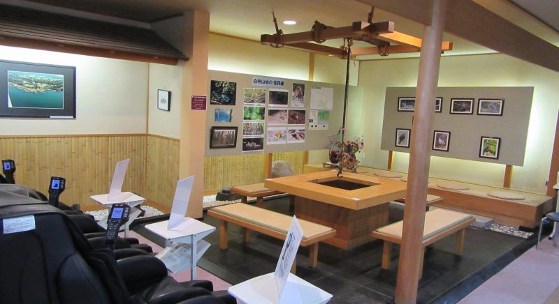 お待ち合わせなどに便利な湯上りコーナーがございます。有料のマッサージチェアがある他、白神山地の写真も展示しています。囲炉裏をモチーフとしたテーブルや椅子に腰かけ、ごゆっくりお過ごしください。