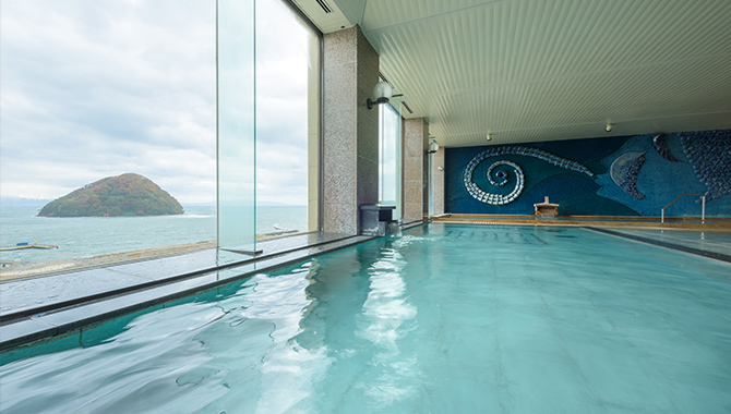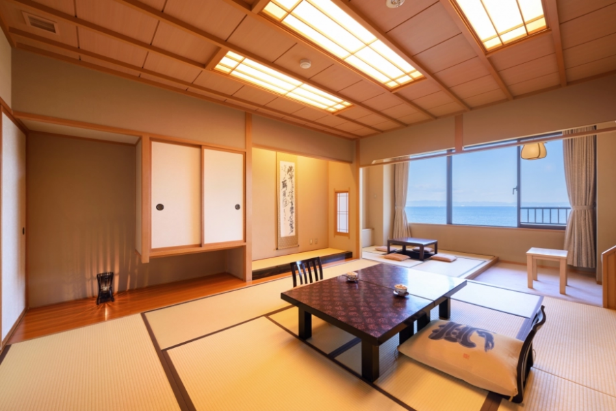 心やすらぐむつ湾の眺めは、ちょっぴり広めの和室客室からと、最上階にある展望浴場から一望できます。