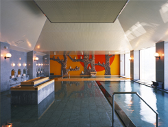 男性用浴場は、目の前に見える「湯の島」に住む小鳥たちをテーマにした陶器を壁面に描いています。