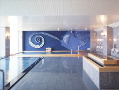女性用浴場は、目の前に広がる「むつ湾」をテーマにした陶器を壁面に描いています。