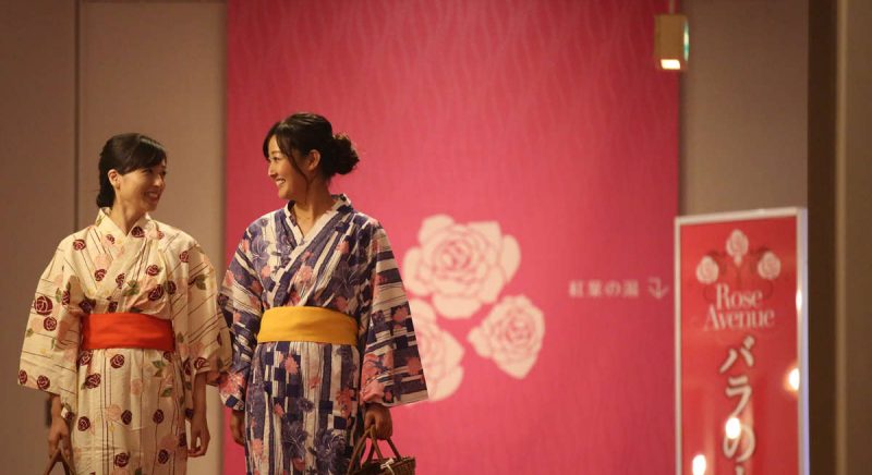 ホテル3館を繋ぐ連絡通路「バラの小径」。バラの模様が施された絨毯やタペストリーが設置され、湯めぐりがもっと楽しくわかりやすくなりました。プリザーブドフラワーや花巻温泉の美しい四季の写真なども展示されています。 -