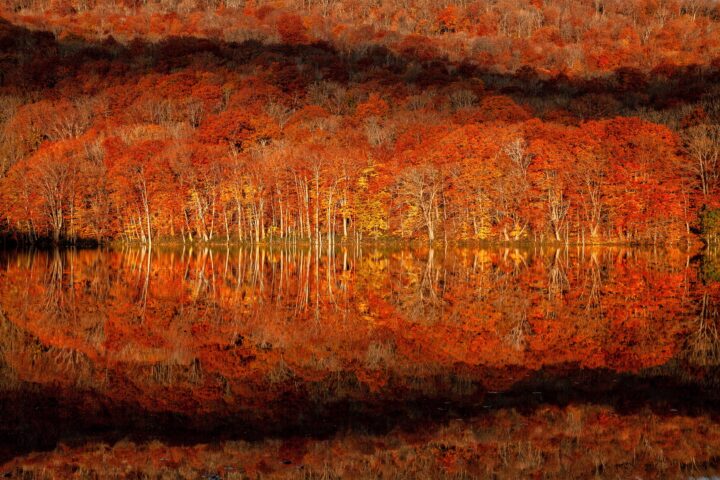 早朝の風のない日には水面が鏡となり赤く染まった木々が湖面に映り込み 息を吞む絶景が広がる。