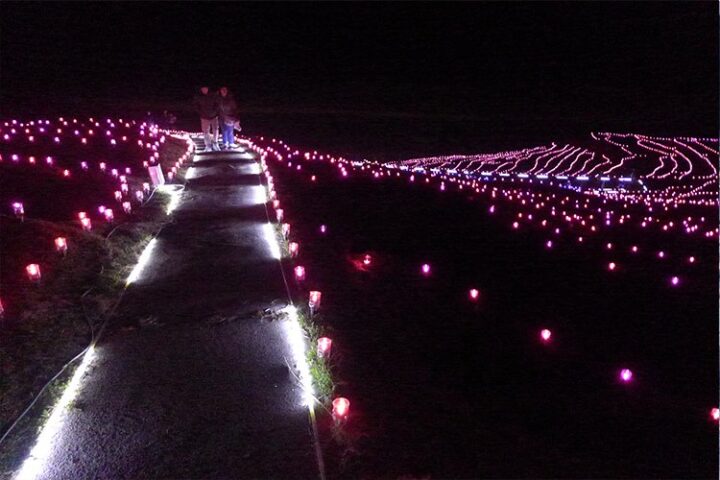 秋冬にはソーラーLEDが彩るイルミネーションイベント「あぜのきらめき」が開催され幻想的な世界が広がる。