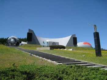 円形の総ガラス張りで交流ゾーン(無料)と展示会ゾーン(有料)に分かれている。