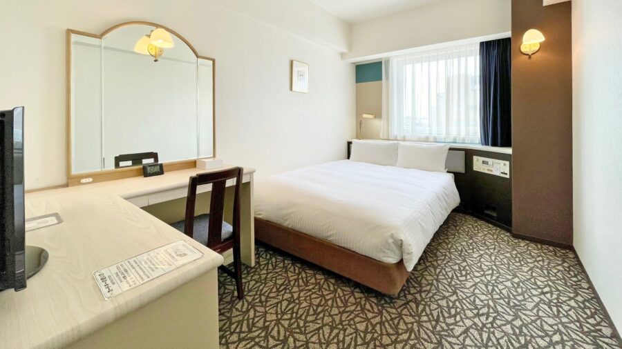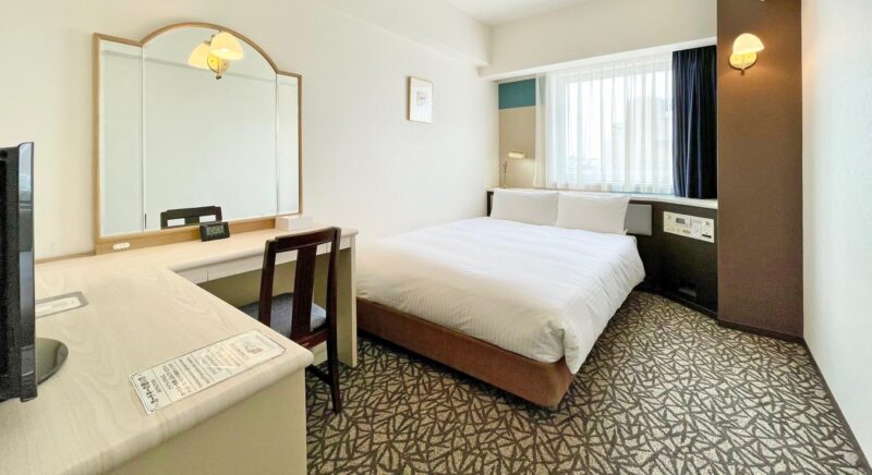 17平米の客室にゆったり1,600mm幅のベッドを配したダブルルームです。すこし贅沢な一人旅にもご利用ください。