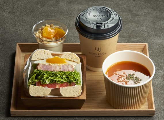 野菜たっぷりの温かいスープと、オリジナルの野菜たっぷりベーグルサンド、または焼きたてのプティパンの朝食セットをご用意しました♪スープとベーグルサンドは日替わり、焼きたてプティパンは季節ごとに内容が替わります。