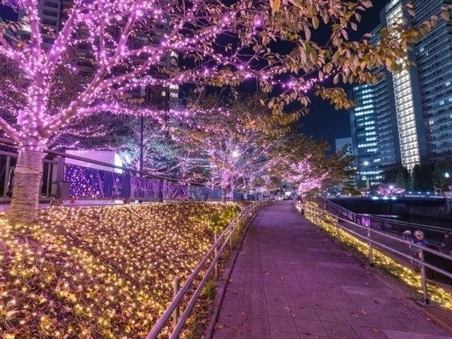 例年11月から2月になると、約2.2㎞に渡って川沿いの木々が35万個の桜色のLEDで装飾され、まるで満開の桜が冬に咲き誇ったかのような景色を楽しめる。