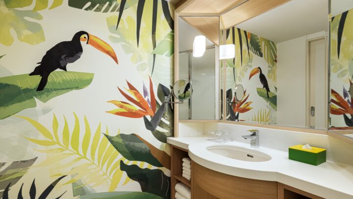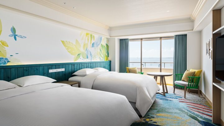 客室にはブルーやグリーン、イエローを基調としたカラフルな葉が散りばめられ、窓から差し込む明るい光とさわやかに吹く風に非日常を感じていただけます。大人の方もお子さまも笑顔が広がるシェラトン・グランデ・トーキョーベイ・ホテルならではのリゾートステイをお楽しみください。