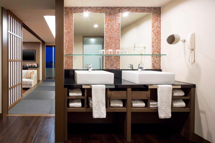 ホテルにいながらまるで高級旅館の離れのような居心地のジャパニーズスイートルームは、最大で6名様までお泊まりいただけます。畳のリビングスペースなどの和洋折衷の空間は大人数でも快適にお過ごしいただけます。バスルームには洗い場と深めの日本式の檜風呂を設置し、和の寛ぎと癒しのひとときを演出。またジャパニーズスイートご利用のお客様限定の専用浴場「ゆう裕」(無料)もご予約いただけます。さらにスイートにご宿泊の方は、無料の朝食やカクテルアワーなどの多彩なシェラトンクラブ特典や、シェラトンクラブ ラウンジを自由にご利用いただけます。4歳から6歳の添い寝のお子様がご宿泊の場合は、シェラトンクラブ特典利用料として1名につき3000円の追加料金がかかります。