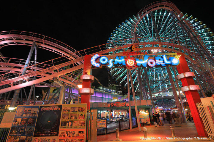 よこはまコスモワールドは、みなとみらい21地区にある都市型立体遊園地。平成1年(1989)の横浜博覧会開催時に造られた大観覧車「コスモクロック21」が目印。絶叫マシンの揃う「ワンダーアミューズ・ゾーン」、人気アトラクションが揃う「ブラーノストリート・ゾーン」、子ども向けの「キッズカーニバル・ゾーン」の3ゾーンに分かれている。入園料は無料で、アトラクションはそれぞれチケットを購入し利用できるしくみ。夜はライトアップされ、夜景スポットとしても知られている。