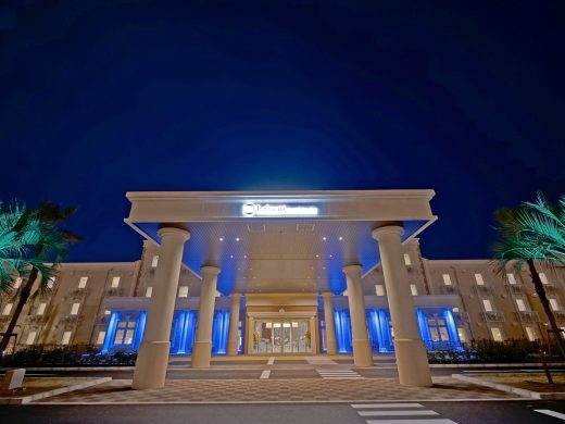 優美なウエーブを描く建物のなかは、広々としたロビーや南国シーサイドイメージの客室など、インターナショナルなラグジュアリー感でいっぱい。