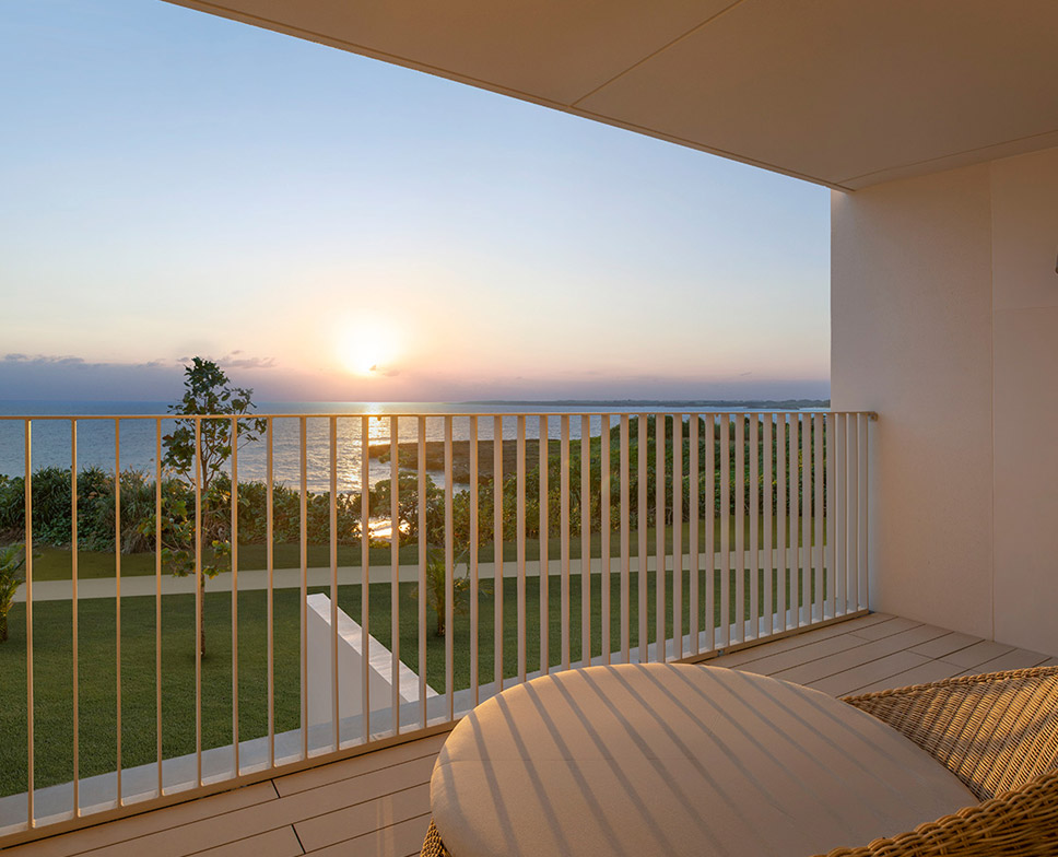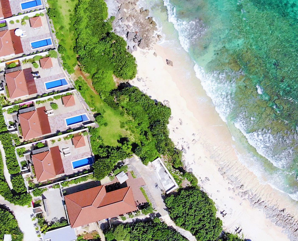 ヴィラブリゾートは宮古空港から車で約25分、伊良部島のオーシャンフロントに建つオールヴィラタイプのスイートホテルです。各棟独立したヴィラは、沖縄の古民家風の赤瓦とバリ調のしつらえ、広大なテラスでは眼前に広がる伊良部ブルーの水平線が一望でき非日常の空間と海の音に抱かれながら、最高のくつろぎを体感していただけます。