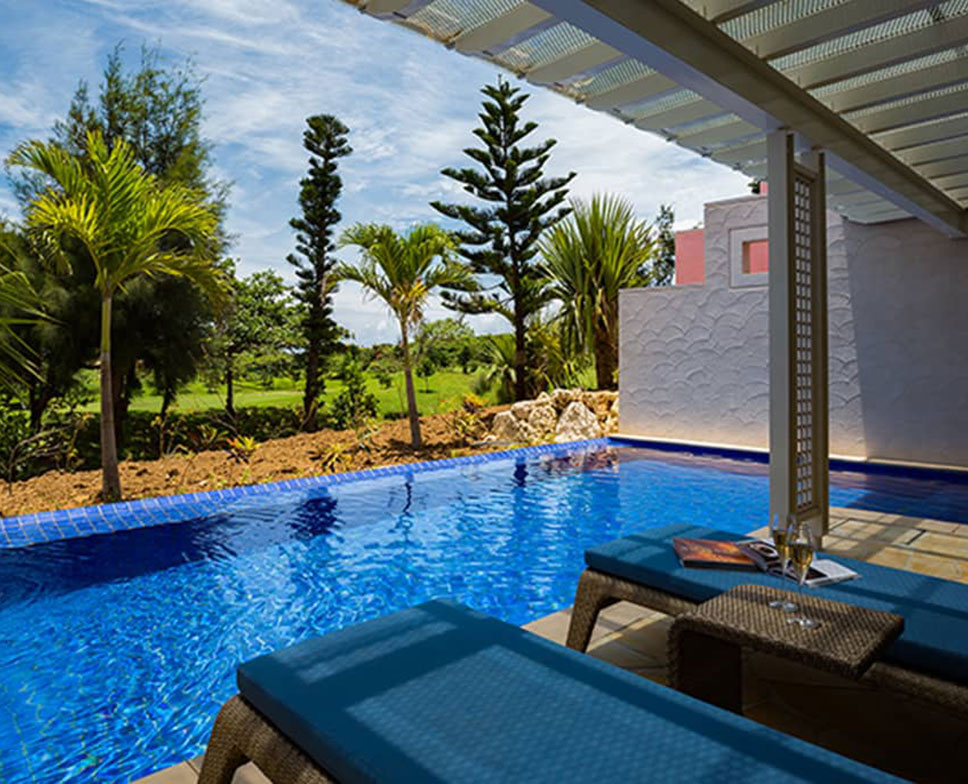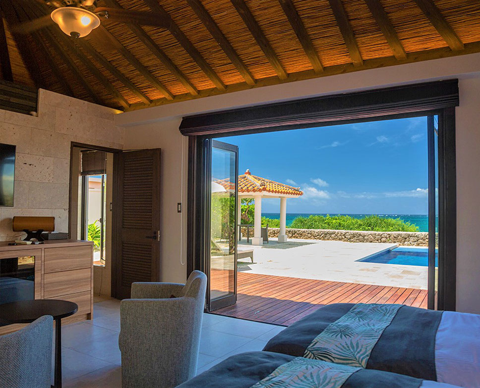 プライベートプール付ヴィラ1ベッドルームのスイート。“海と空と大地、移りゆく景色の調和”ヒルサイドの1・2階に位置する約61~64m²のヴィラスイート。