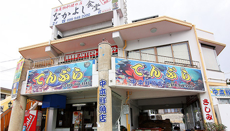 奥武島にある「中本鮮魚てんぷら店」で食事をしよう。会計後、レジにあるQRコードを読み込むとアプリ上でコインを獲得できます。