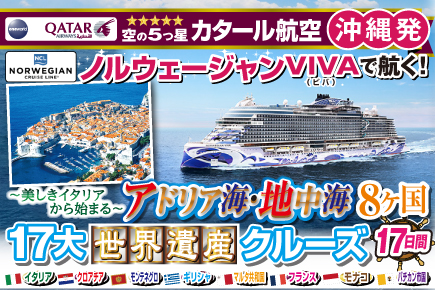 《沖縄発》【11月4日出発限定】ノルウェージャンVIVAで航く!〜美しきイタリアから始まる〜アドリア海・地中海8ヶ国17の世界遺産クルーズ17日間