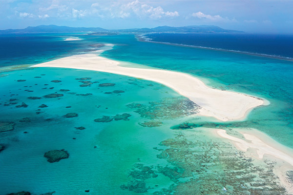 潮の満ち引きによって現れる、「幻の島」とも呼ばれる浜島。小浜島と竹富島の間の位置にあり、真っ白な砂浜と透き通るような海は、非日常的で開放感に満ち溢れ、八重山屈指の絶景スポットとして人気の景勝地。
