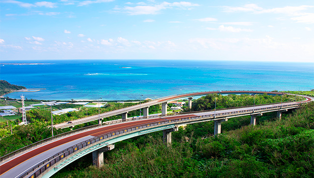 太平洋を一望出来る絶景スポット!トンネルを抜け高低差がある橋を下ると目の前に青い海と空が広がります。ニライカナイとは、沖縄の方言で海のむこうにある理想郷を意味します。