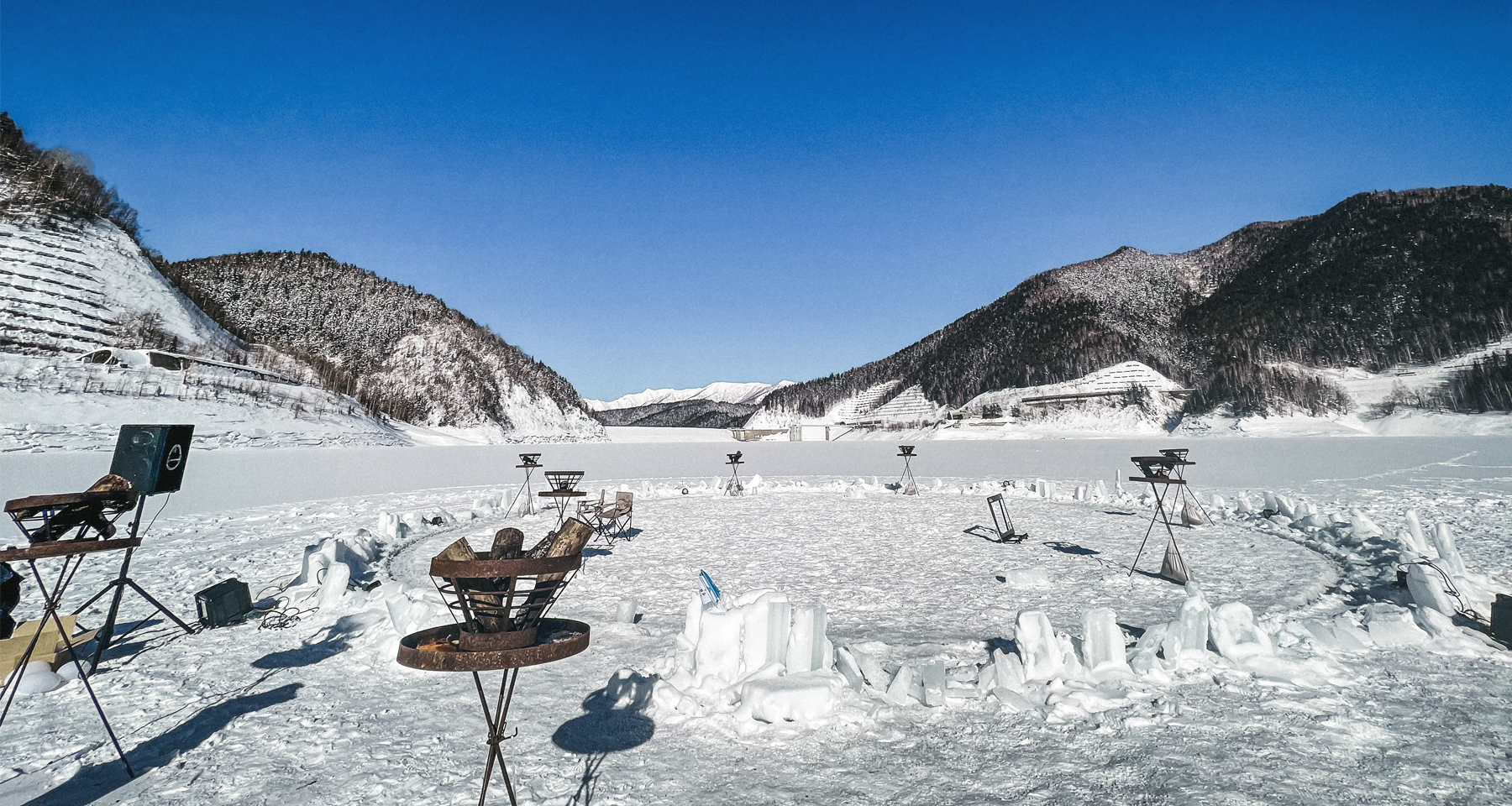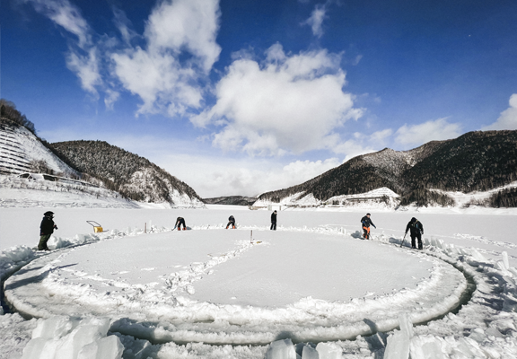 ダム湖の中からの白銀に包まれた絶景の峡谷美を楽しみながら、氷のメリーゴーランドに乗って楽しめます。普段は経験できないプレミアムな体感を! 氷結したダム湖を直径15Mに切出し、手動で切出して浮いている氷を回転させて、その上に乗って360度のパノラマを体験! ナイトタイムは、幻想的なライトアップの中、回転する氷の上でインスタ映え間違いなしの記念撮影も!。